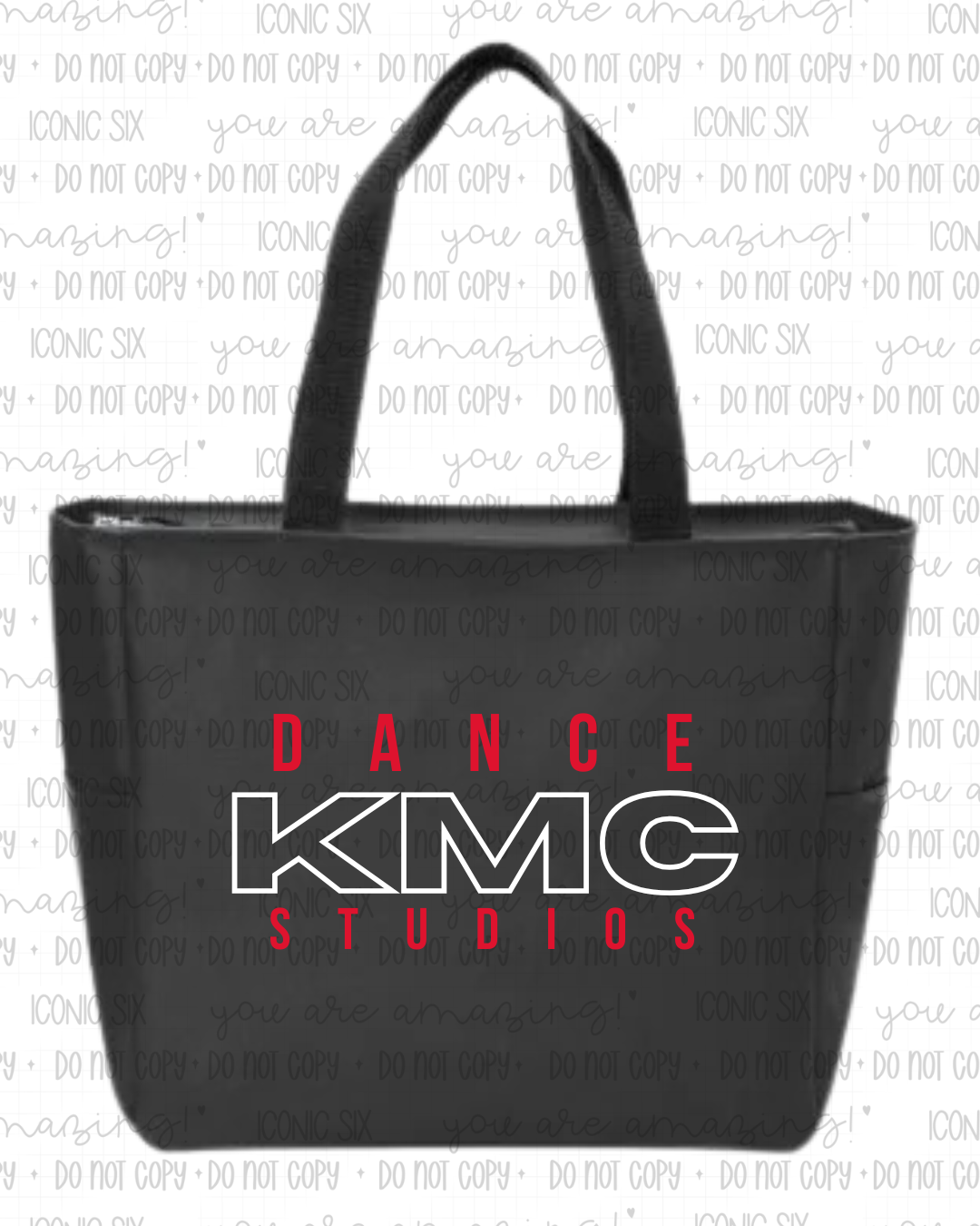 This black essential zip tote comes with this printed KMC Dance Studios design across the front.