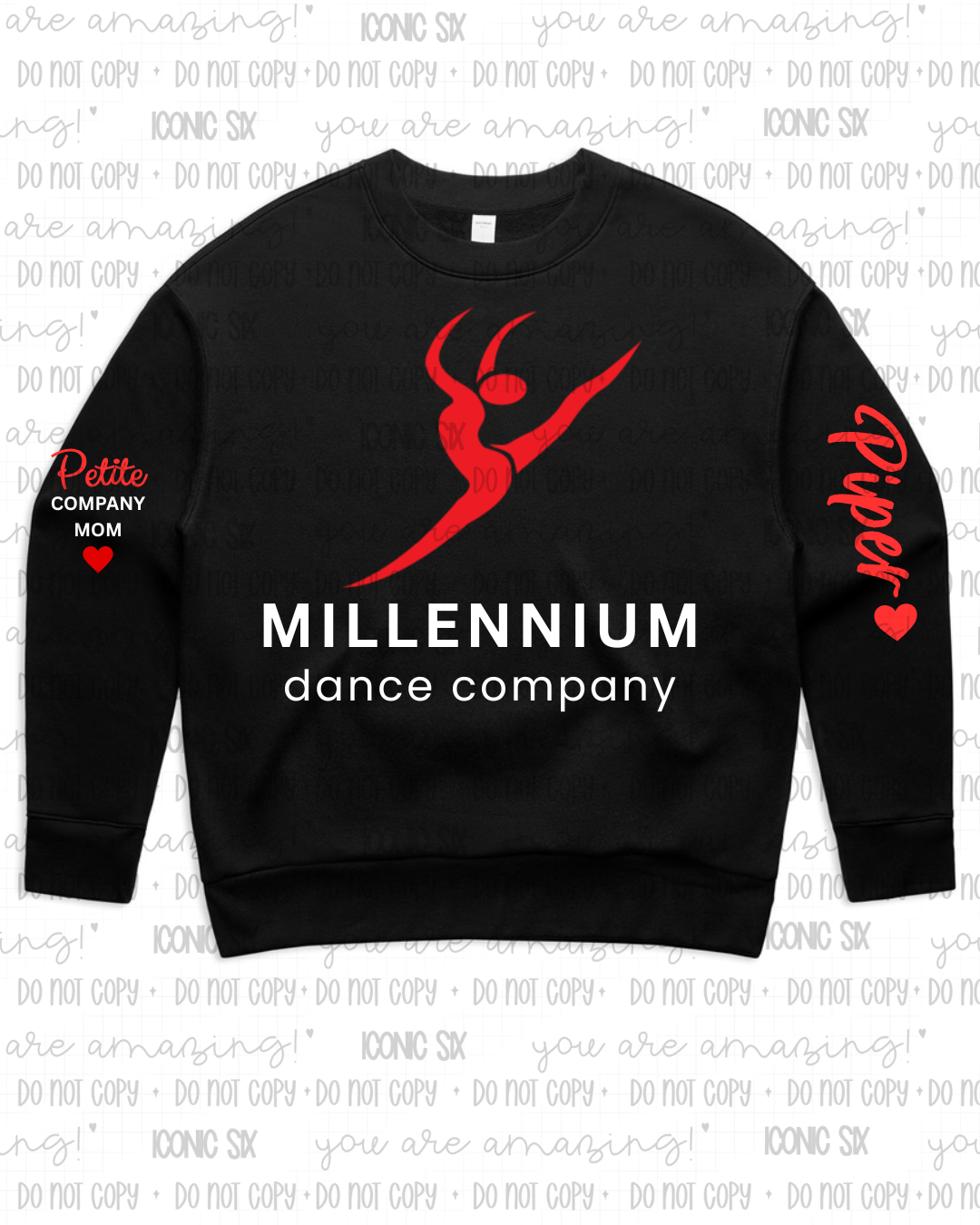 This unisex style black crewneck comes in adult sizing. It features Millennium Dance Company across the chest on the front. One sleeve has Petite Company Mom/Dad and the opposite sleeve has the dancers name in script with a heart.