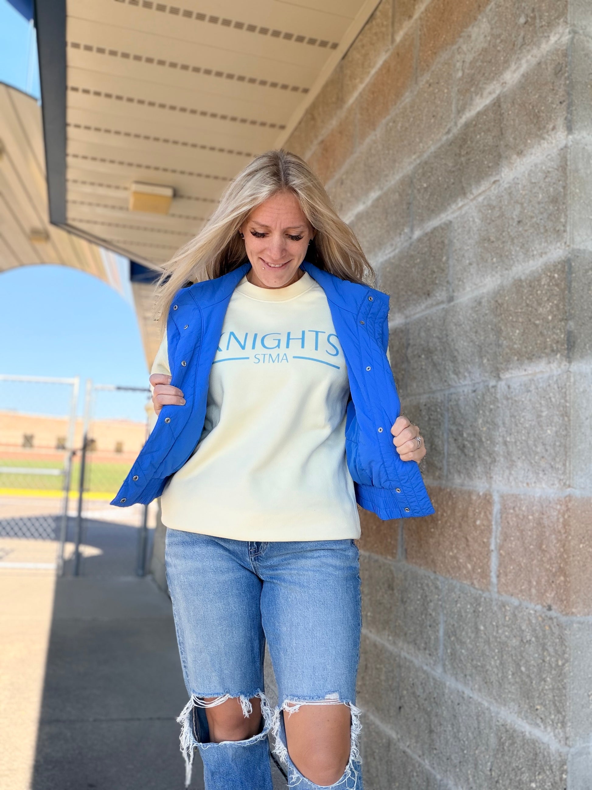 This unisex style butter colored premium brand crewneck comes in adult sizing. Its different then your traditional knights colors as this yellow Is a very light yellow. It features Knights STMA across the front in a printed light blue color. It features a knights head on the upper left sleeve. Pair it with a vest or a jacket and you have the perfect outfit for any sporting event!