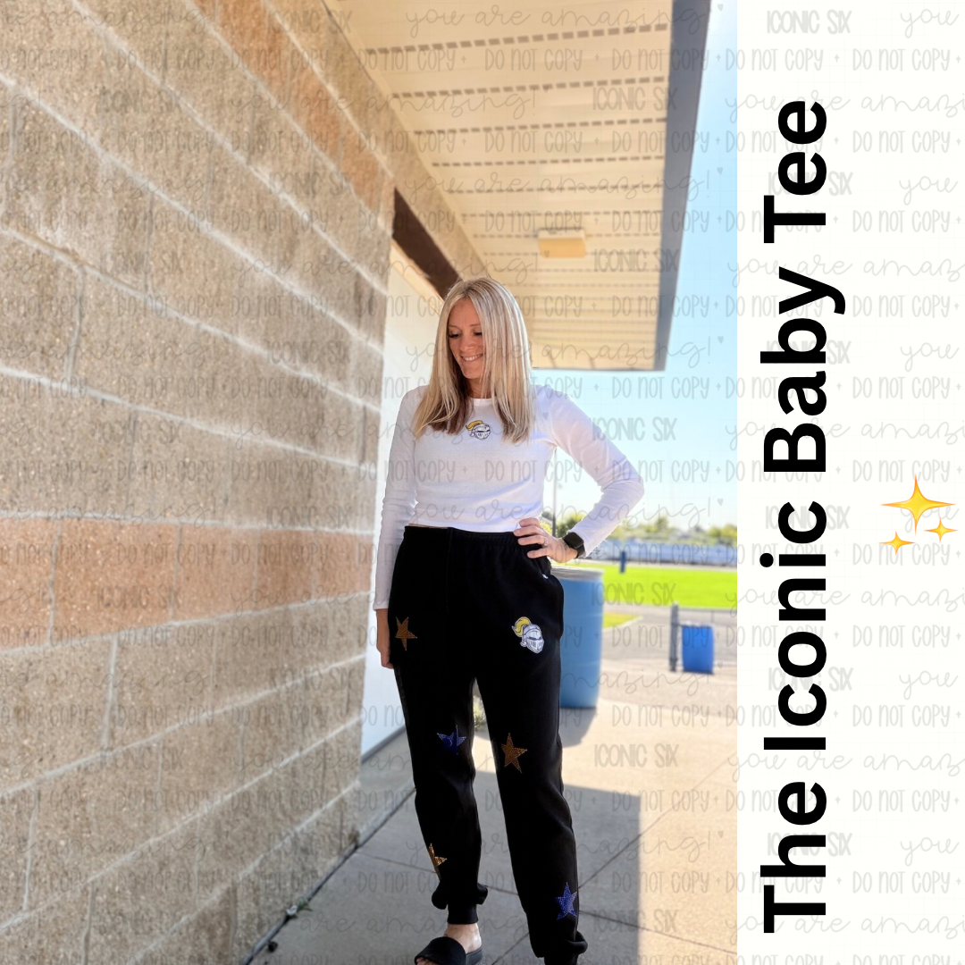 This women’s style cropped baby long sleeve comes in adult sizing. It comes in the color white and features a small logo on the middle of the chest.